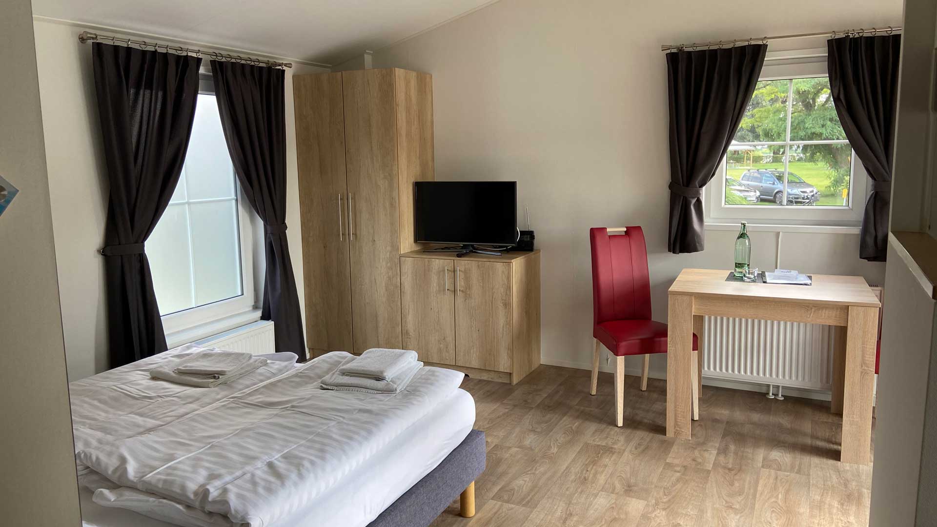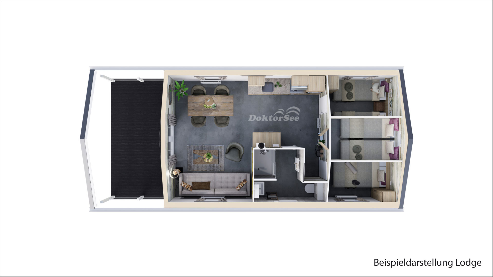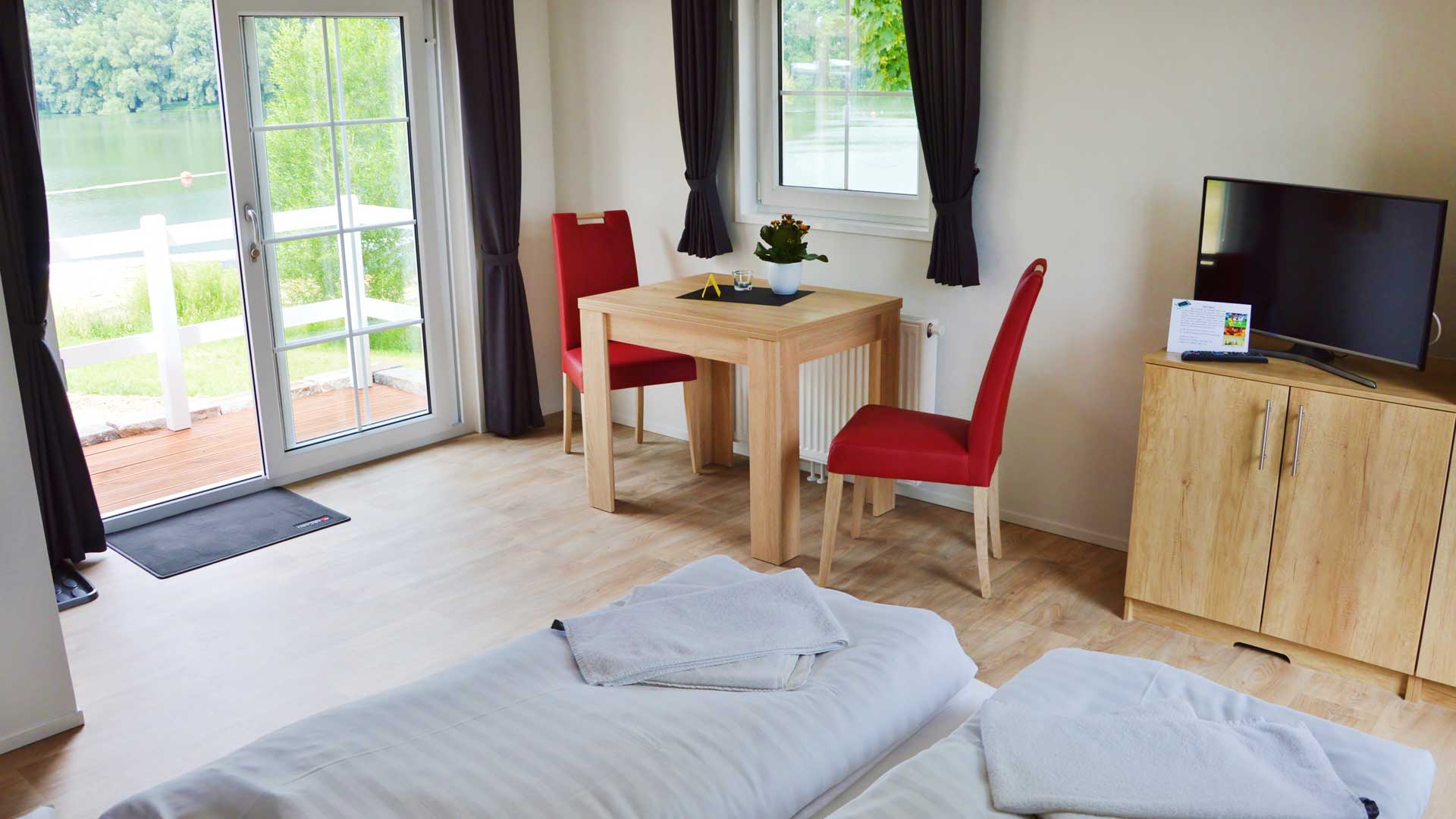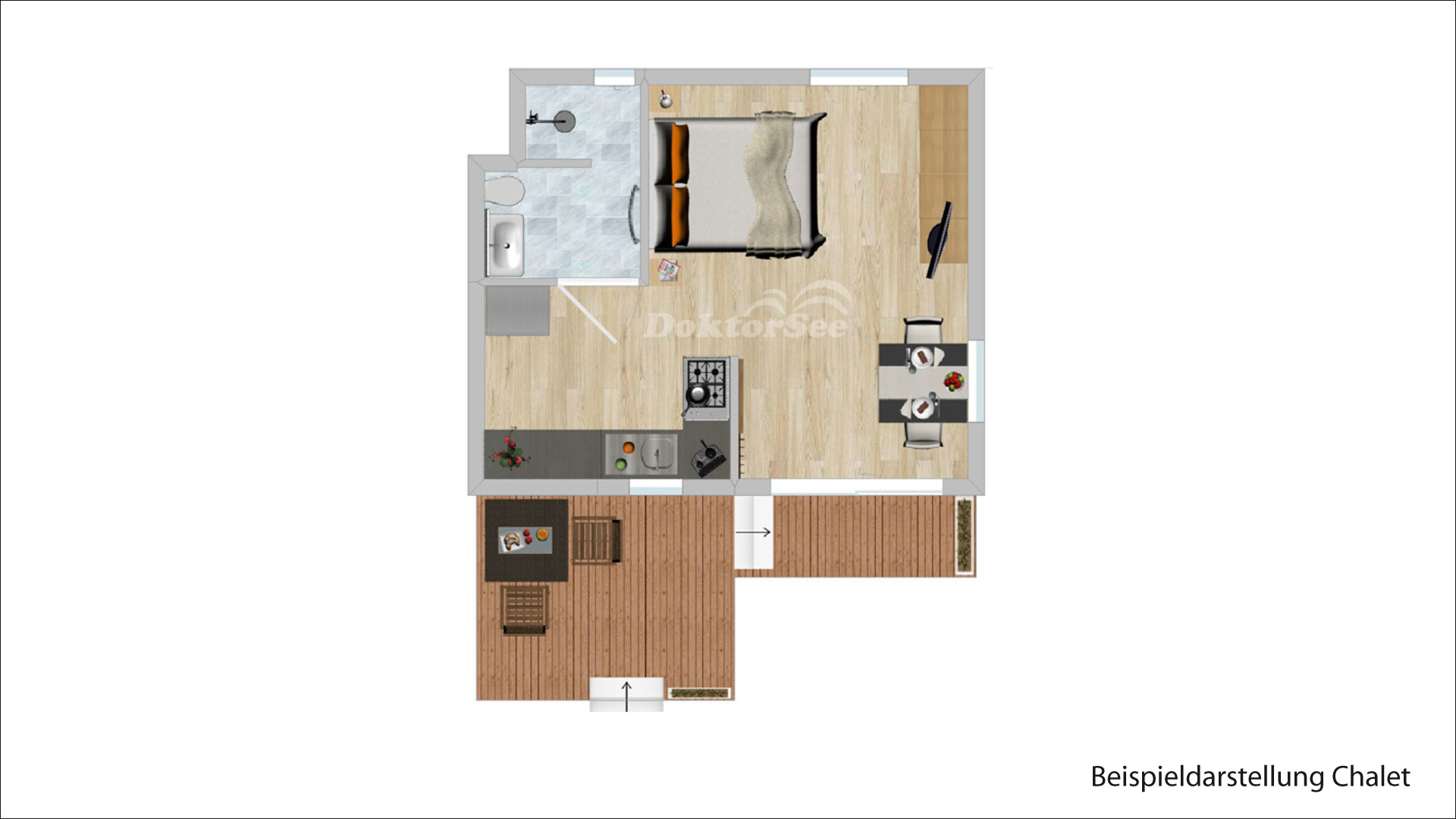 Close to the lake and just a stone’s throw away from the sauna oasis, our premium holiday chalets are available for your holiday. A 26 m2 double room with a small kitchen and a modern bathroom awaits you. We will be happy to provide a travel cot and high chair upon request. Step outside onto a wooden floor terrace, snuggle up in a comfortable box spring double bed (German size), and make use of convenient amenities, such as a dishwasher and air conditioning. This way you can enjoy your time!